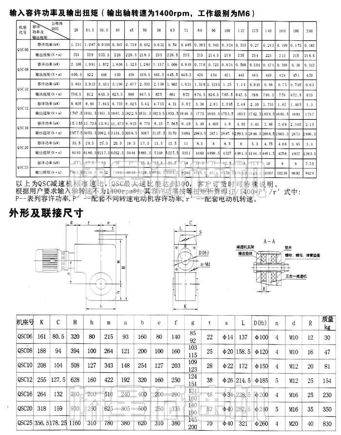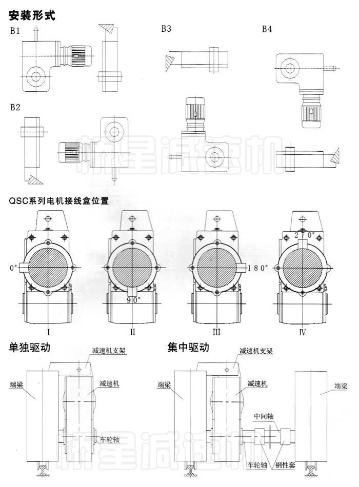 QS/QSC/QSF/QSK型三合一減速機融減速器、電動機、制動器與一體,結構緊湊,安裝使用、維修便利,可根據各自的使用要求選配電動機,輸出型式為漸開線花鍵、平鍵空心軸及實心軸等,既可單端輸出,亦可雙端輸出。QS、QSF型為平行軸式減速機,適用于單、雙梁橋工起重機的大、小車運行機構及冶金行業軋機、連鑄機的輥道驅動:QSC、QSK為垂直軸式減速機,適用 于門式起重機的大車運行機構及有空間位置限制要求的其他傳動機構。