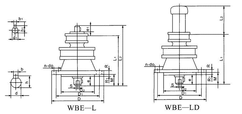 b、雙級減速比機型有WBE1065型、WBE1285型、WBE1510型。其減速比分別有:121、187、289、385、473、595、731、989、1225、1849。