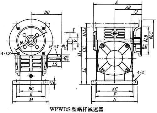 WPWDS40、WPWDS50、WPWDS60、WPWDS70、WPWDS80、WPWDS100、WPWDS120、WPWDS135、WPWDS155、WPWDS175、WPWDS200、WPWDS250、型蝸輪蝸桿減速器主要尺寸